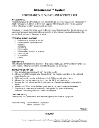 Percutaneous sheath introducer kit intended to be used for percutaneous introduction of 0.035 inch (approx. 0.89mm) or 0.038 inch (approx. 0.97mm) guide wires into the vascular system following a small 21 gauge needle puncture.