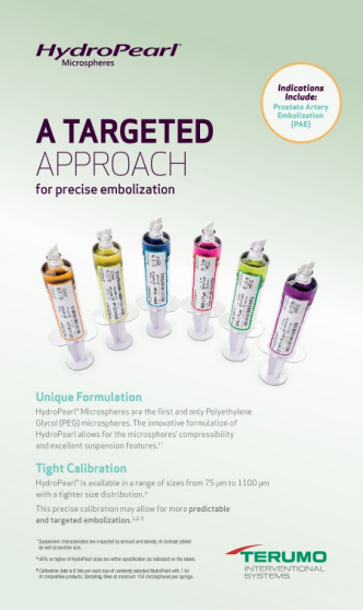 HydroPearl® Microspheres are the first and only Polyethylene Glycol (PEG) microspheres. They are engineered for accurate embolization at the target area.1,2