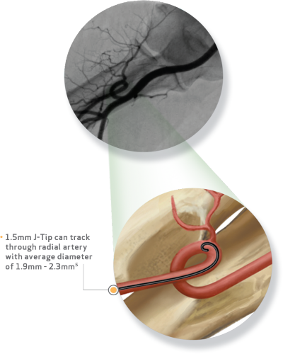 The J-Tip wire is designed to avoid side branches of the radial artery and to minimize the potential risk of perforation and other complications.