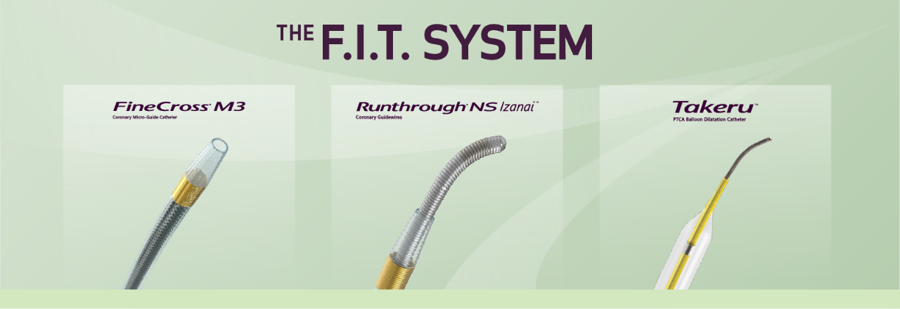 FINECROSS® M3 Coronary Micro-Guide Catheter, RUNTHROUGH® IZANAITM Coronary Guidewire, and the TAKERU® PTCA Balloon Dilatation Catheter; engineered to provide an innovative balance of properties for the simple to complex PCI procedures.