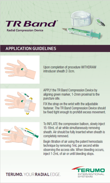 - NOTE: Guidelines are based on compilation of best practices. TR BAND Compression Device removal protocols should be consistent with the needs of the provider(s) and patient. Air injection volume and compression time may differ according to the patient’s condition, anticoagulation, and puncture site size. Check the puncture site frequently and adjust accordingly.